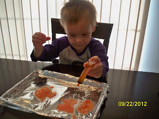 We made our own volcanoes this morning! We just dropped some colored vinegar on a little pile of baking soda and watched it fizz up. The boys were pretty impressed. Then we made one big volcano in a cup of baking soda, poured the vinegar over the top of it and watched the cup overflow. Conner and Ben love volcanoes so they thought this was pretty fun!
