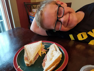 Everyone was kind of full for dinner tonight, so the boys made themselves a sandwich. We just have to work on cutting it in half... Conner destroyed his! They do love doing these little things now that make them feel more "grown up!"